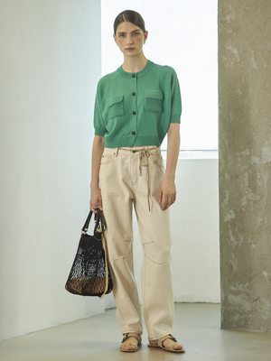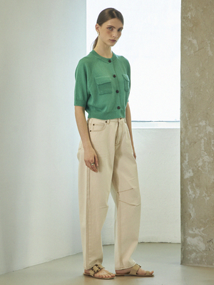 A round neck pullover knit cardigan with button closure along the center. Features a petite, cropped silhouette with mixed linen pocket details. The linen-mixed fabric allows for fresh wear. Contrasting rib at the sleeves and button details create a clean look. Available in one size. 65% Rayon, 35% Nylon. Made in Korea.