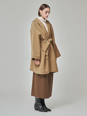 This handmade hooded cape coat features fully hand-stitched construction for clean seams, lightweight wear, and excellent warmth. The cape silhouette drapes naturally around the body for a dramatic effect, while the hood adds a soft, casual touch. Designed with an oversized fit for comfortable layering. Crafted from a premium blend of 10% cashmere and 90% wool for a luxuriously soft and warm feel. Available in one size. 10% Cashmere, 90% Wool. Made in Korea. Dry cleaning only.