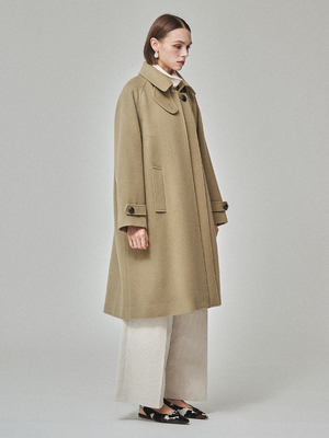 This coat features an asymmetrical front placket that redefines the central line for a distinctive focal point within a minimalist silhouette. The design removes extraneous embellishments, allowing the dense 100% wool fabric and structure to convey a quiet yet powerful presence. Lapels, pockets, and plackets are minimized to maintain clean, uninterrupted lines. The oversized fit and long length create a flowing drape and generous volume for a refined silhouette that flatters all body types. Available in one size. 100% Wool. Made in Korea. Dry clean only.