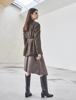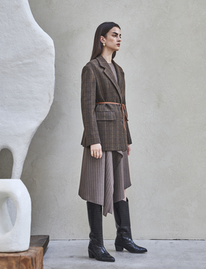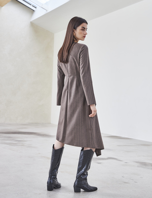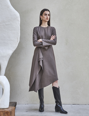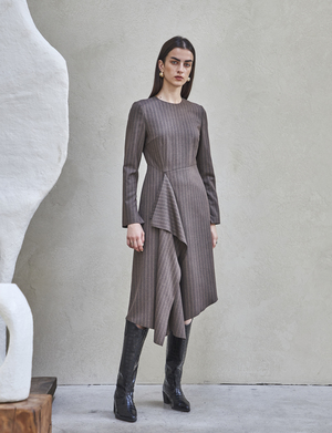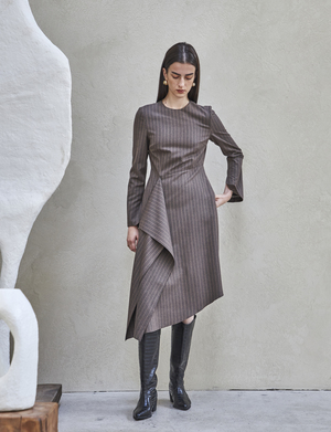 FRONT SHIRRING DRESS (Brown) - Draped wrap dress with shirring detail all along one side. - Designed to have a loose fit silhouette. - Back zipper closure. - Fully lined with side pockets. Available in two sizes: S, M POLYESTER 65%, RAYON 35%