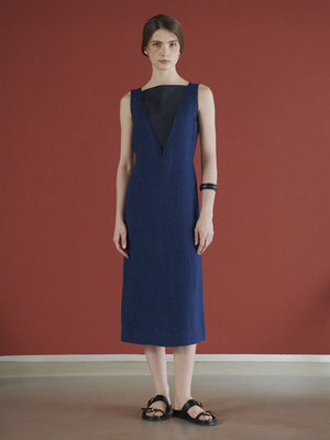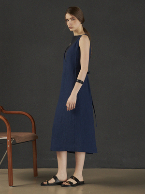 Sleeveless draped dress with a v-neckline. Can be worn alone or layered with other items for various moods. The linen fabric is soft and allows for good ventilation. Unique details at the hem of the neckline and sides. Back hidden zipper opening. 100% Linen / Contrast: 52% Rayon, 48% Polyester. Made in Korea.