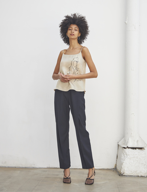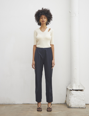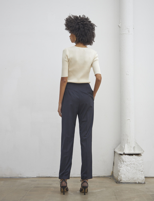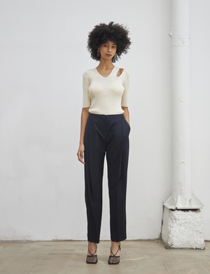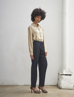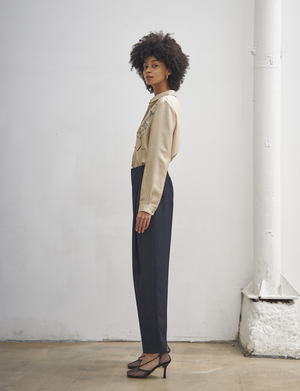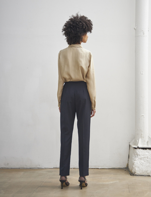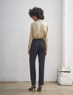 SUMMER STRAIGHT SLACKS (Navy) - Straight fit slacks made out of lightweight fabric. - Unique deep shirring detail at the front. Available in two sizes: S,M POLYESTER 65%, RAYON 35%