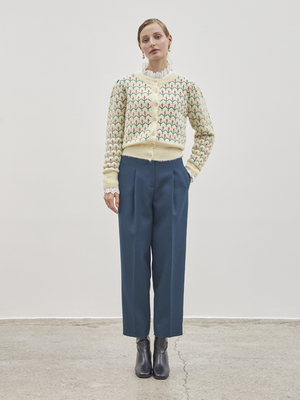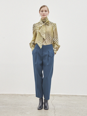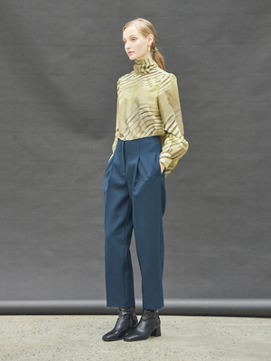 Twill Wool Slacks (Deep Blue) - Straight fit slacks with pintuck details. - Made with wool mixed heavy fabric. - Rough finishing detail creates a vintage mood. - Unbalanced back pockets. - Side pockets. Available in two sizes: S, M Wool 70%, Rayon 30%