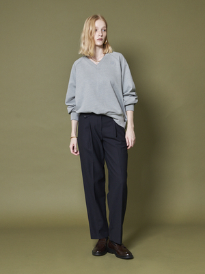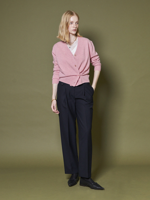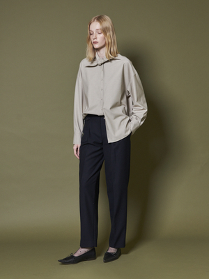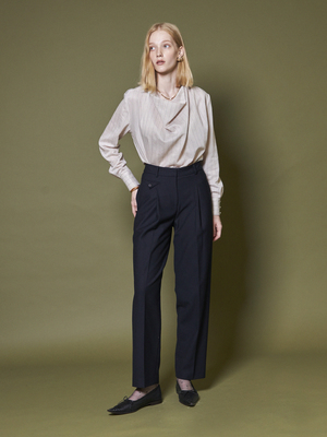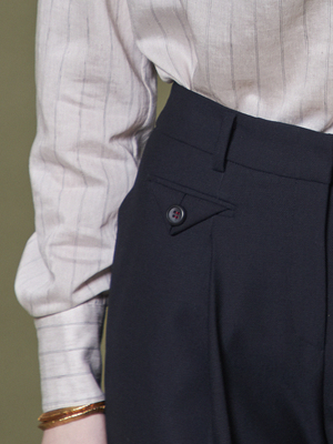 POCKET BUTTON SLACKS (NAVY) - Straight fit slacks made with wool mixed elegant, heavy weight fabric. - Pin-tuck details and clean, triangular buttoned pocket at the front. - Single welt pocket at the back. Available in two sizes: S, M. 70% polyester, 21% rayon, 9% wool.