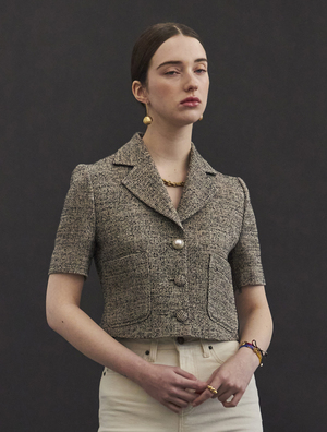 TWEED CROPPED JACKET (BROWN BLACK) - CROPPED JACKET MADE WITH UNIQUE LINEN TWEED FABRIC. - ONE BUTTON OPENING. - CAN BE MATCHED WITH OUR TWEED SKIRT TO CREATE A 2 PIECE SET UP. AVAILABLE IN TWO SIZES: S, M LINEN 60%, ACRYLIC 30%, POLYESTER 10%