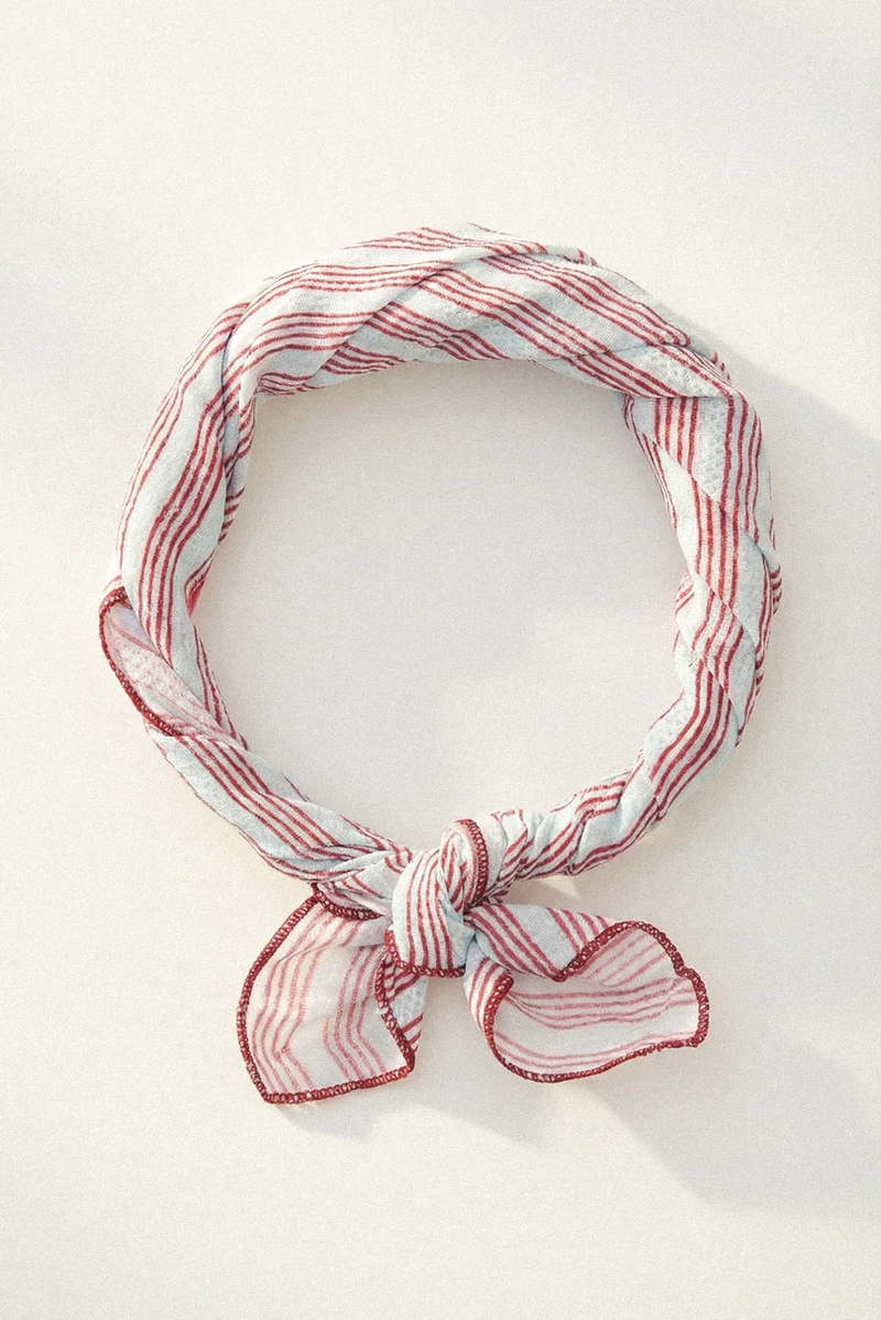 Cut in lightweight cotton dobby, this bandana echoes vintage-washed red pajama lines and traditional sailor stripes, blending the ease of beachwear with the familiarity of inherited pieces. Designed to be worn with nonchalance, it can be styled as a foulard, top, belt, or knotted at the collar. Less about finishing a look, it is more about attitude, movement, and the mood it creates. 100% cotton.