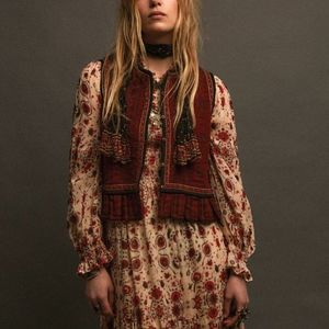 The Casilda Vest in Chateau Bordeaux is crafted from cotton gauze, offering a lightweight yet structured feel. Finished with embroidery tracing the piping and ruffles at the hem in a contrasting shade, this vest highlights its artisanal character while maintaining an easy-to-wear silhouette. Ideal for layering over dresses, blouses, or denim.