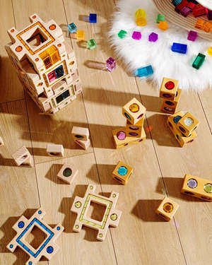 Bring creativity to your child's playtime with these enchanting wooden sensory blocks. Each block is carefully crafted from natural wood and adorned with sparkly gems that cast dazzling reflections when hit by light. Designed for endless open-ended play, these blocks encourage children to stack, build, and explore color and light interactions. Frankie blocks are designed to enhance sensory experiences, inviting little ones to engage in hands-on learning while developing fine motor skills and color recognition. Their smooth edges and lightweight feel make them easy for small hands to grasp, promoting imaginative construction and pattern-making.