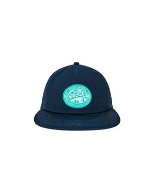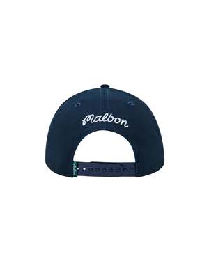 Midnight blue cotton twill snapback featuring a classic 5-panel construction. This unstructured painter's hat delivers relaxed style with an adjustable snapback closure for a customized fit. Woven Pearl of the Antilles patch adorns the front, while embroidered Malbon script branding appears on the back. Style: C-M-9809-MND.