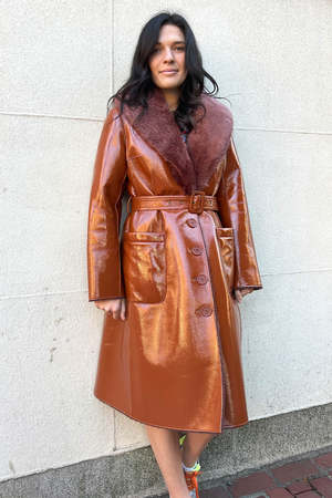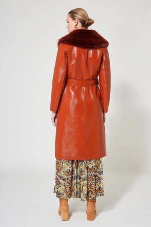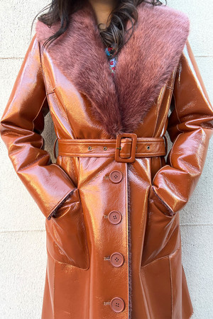 Leatherette vinyl coat with faux fur collar. It is buttoned and belted at the waist and closes with a buckle. Two large pockets in front. Shearling lining.