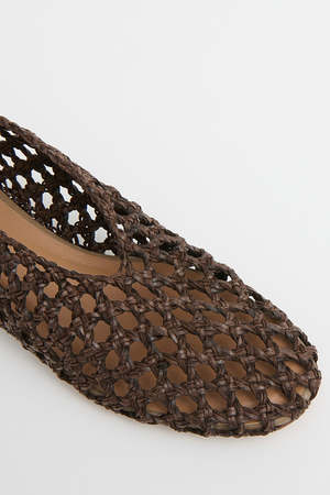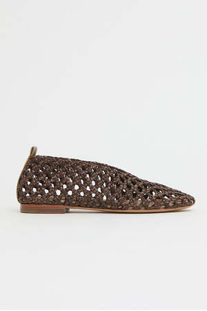 The Woven Ballerina offers a flexible fit that molds comfortably to your foot. With a cushioned vegetable tanned sole for comfort, this flat features a round toe and a simple, clean design. We recommend sizing down a half size. Heel height: 0.40 in / 10 mm Composition: 100% woven non-leather Insole: 100% Italian lambskin leather Made in Portugal. MG's woven material is a non-leather textile from Atresa, a family-owned mill in Spain specializing in braided and woven constructions originally handmade by local artisans.
