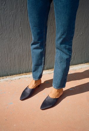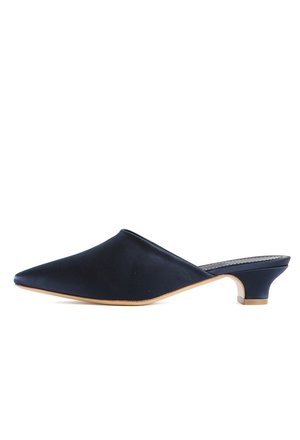The Mansur Gavriel Silk Elegant Slide is a navy colored slip on heel . Made of Italian silk it features a calf leather insole, pointed toe and small block heel. - Materials: Silk and calf leather - Made in Italy - Size: Italian sizing, (36=US women's 6) 40mm heel - Style Code: FES041SI