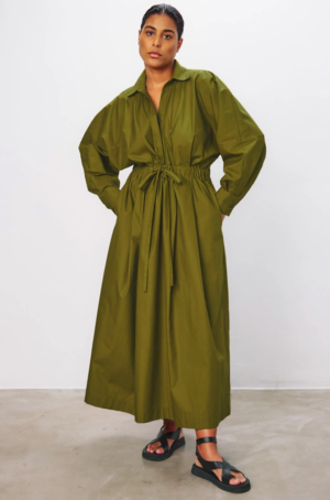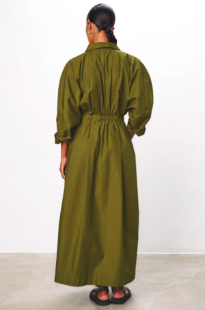 Colleen is an ankle-length shirt dress with a full pleated skirt. An elastic waistband with an adjustable drawstring cinches at the natural waist for a gathered silhouette. Rounded dolman sleeves accompany a hidden button placket, cuffs at the wrists and side seam pockets. Made from a light weight organic cotton in a perfect neutral olive. This classic piece is perfect for any warm weather occasion and is effortlessly dressed up or down with your favorite shoe. Also available in a beautiful multi color print. Mara Hoffman is an eponymous label founded in NYC in 2000. Committed to implementing sustainable and responsible practices, Mara brings us timeless, colorful collectsions inspired by and in celebration of women. - 100% Organic Cotton - Made in Portugal