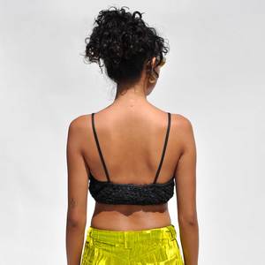 Rosie is a sleeveless bustier top with rosette details hand tacked to structured cups. Featuring stay-stitches throughout the spirals to maintain volume and shape, pop-corn texture smocking throughout and elastic along the top. Includes interior extensions to alter the length of the spaghetti straps. Pair with the coordinating Nicole skirt. Made from 100% organic cotton in black. 100% organic cotton. Made in India.