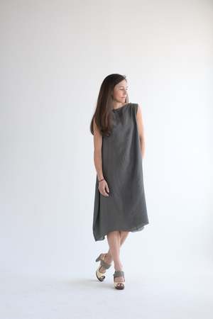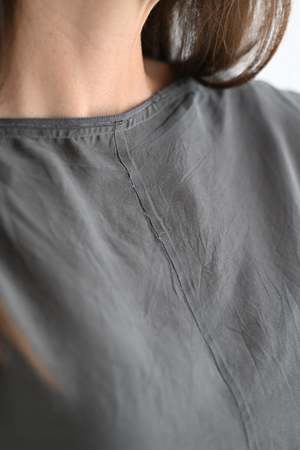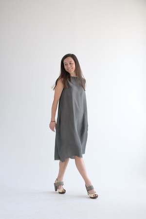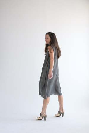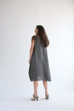 Marc Le Bihan signature balloon dress in the lightest silk. 100% silk. Made in France. Dark grey color. Adeline is wearing size 38. Dress is ever so slightly sheer (no slip used in photo).