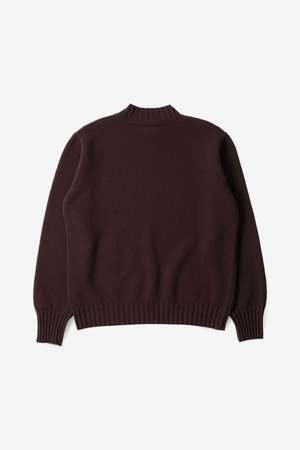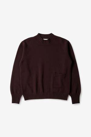 The Single Pocket Crew in Mahogany by Margaret Howell is a relaxed-fit jumper densely knitted in midweight Geelong lambswool with a soft hand feel. It is fully fashioned with a deep crew neck, raised shoulder seam, integral knitted pocket, and refined rib trims. Style code: MEKN0531A25MPAMAH Composition: 100% Wool Season: AW25
