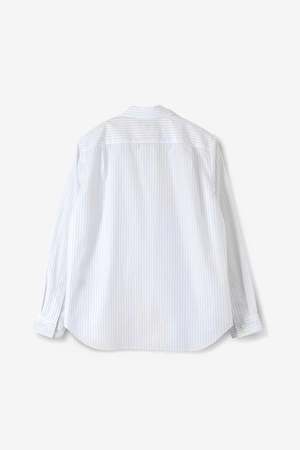 The Basic Shirt in white and grey by Margaret Howell has a regular cut in finecount cotton poplin with a crisp hand feel. Designed with a chest pocket, curved hem, and pleats on the back yoke, and finished with motherofpearl buttons. Composition: 100% cotton.
