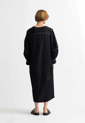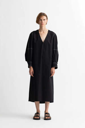 Deep v neck dress with engineered sleeves, side pockets and double box pleat at back for beautiful cocoon like effect. Sleeves are finished with our signature double stitched, 2 button cuff. Contrast stitch detail throughout. Ships with self-belt. Generous, relaxed fit - meant to be worn oversized. Model is 5'10", wearing a size small Dry clean only Portuguese 100% Organic Cotton Certified by GOTS