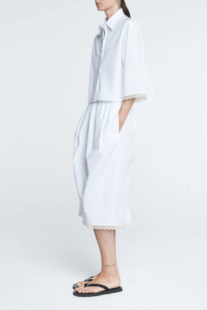 - Finished with a delicate, ivory French lace detail at the cuff - Shorter, cropped length - Center box pleat at the back - Wide, short sleeves - 100% GOTS Organic Cotton sateen - Made in Portugal
