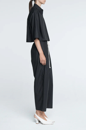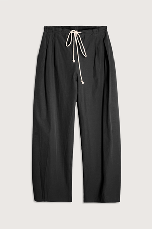 - Added volume to the leg - Tapered bottom to the trousers - Front pleats - Lightweight organic washed cotton - Loose drawstring trousers - Slightly tapered bottom and pocketing - 100% Organic Cotton - Made in Portugal