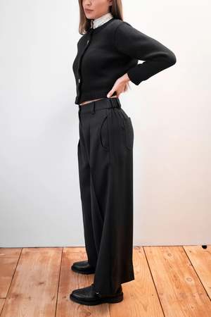 An easy wide-leg trouser, Sloane features a tailored waistband with two tucks in front and elastic in back for a flattering and easy fit. Striking the balance of grace and comfort, Sloane has a zip fly with a seashell button closure, side curved pockets, and back patch pockets. French seam finished throughout. Made by Maria Stanley in India. CONTENT & CARE: 100% organic cotton Italian denim. All-natural button made from the shells of pearl oysters. Green dry clean recommended. High iron as needed. MEASUREMENTS (laying flat): XS: 12 3/4" waist, 19 1/4" hip, 12 1/2" front rise, 28" inseam, 12 1/2" thigh, 12 3/4" leg opening S: 13 3/4" waist, 20 1/4" hip, 13" front rise, 28" inseam, 13" thigh, 13 1/4" leg opening M: 14 3/4" waist, 21 1/4" hip, 13 1/2" front rise, 28" inseam, 13 1/2" thigh, 13 3/4" leg opening L: 15 3/4" waist, 22 1/4" hip, 14" front rise, 28" inseam, 14" thigh, 14 1/4" leg opening THIS ITEM IS FINAL SALE.