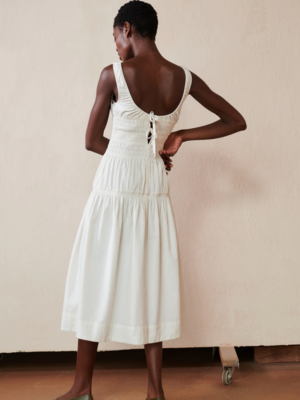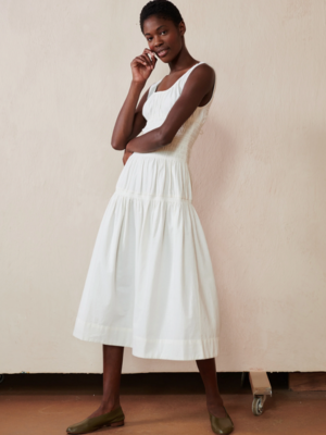 Sigrid is a midi length sleeveless dress with an alternating smocking pattern throughout the bodice for a flattering fit. The deep scooping front and back necklines are adjustable with a twill tape drawstring. Finishes with a chunky hem. Fully lined with organic cotton. - Ethically made with 100% organic cotton khadi in Noida, India. - Hand wash cold and hang to dry. Low iron if needed. Do not bleach. Model is 5' 9" and wearing a size XS. XS | 49" length | 13 1 / 2" chest | 12 1 / 2" waist | 32" bottom sweep S | 49 1 / 2" length | 14 1 / 2" chest | 13 1 / 2" waist | 33" bottom sweep M | 50" length | 15 1 / 2" chest | 14 1 / 2" waist | 34" bottom sweep L | 50 1 / 2" length | 16 1 / 2" chest | 15 1 / 2" waist | 35" bottom sweep About Maria Stanley With a strong consideration to detail and meticulous craftsmanship, Maria Stanley takes a less-is-more approach to dressing with purpose and building an everlasting holistic wardrobe . Soft and buttery textiles are sourced locally by the brand's Indian and Peruvian mills who share like-minded sustainable ideals in order to treat our Earth as kindly as possible. Materials are never synthetic and free fro unnecessary plastic, down to the seashell buttons and organic cotton packaging.