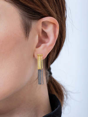 Pair of bicolor sterling silver earrings composed of forat chain tassels dip-dyed in yellow gold and ruthenium. - Sterling silver with 18 karat yellow gold and ruthenium finish - Height: 4 cm