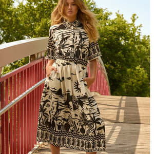 Prairie-style dress with custom print of black on natural 70% rayon, 30% rayon. This garment is CUT SMALL please size up from usual. Size L: shoulder seam to shoulder seam 14.5", underarm to underarm 22". Size XL: shoulder seam to shoulder seam 15", underarm to underarm 23". Made in Montreal.