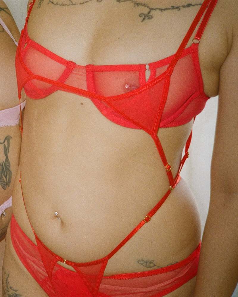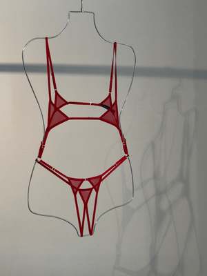 Thin body cage harness with tiny triangle bra cups and an ouvert bottom. - Nylon elastics and 100% polyester knit - Completely adjustable in length and around body - Made in Mexico FINAL SALE.