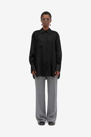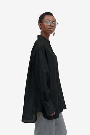 The Sigga Light Ramie Shirt by Mark Kenly Domino Tan features a lightweight ramie construction in black. Long sleeve design.