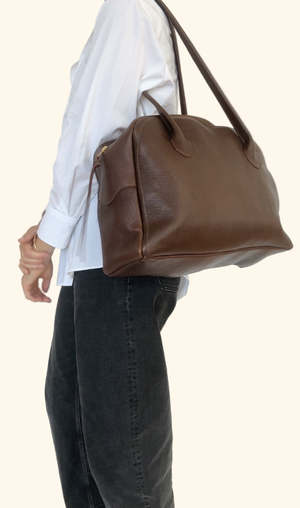 The Amandine bag from Market Canvas is a luxurious leather travel bag with a timelessly chic appeal. Made from soft and supple top grain leather, this bag features a large zippered pocket, a smaller device pocket on one side, and two additional organizational pockets on the other. Use it as your carryall for city outings or as a reliable travel companion. 20"W x 14"H x 6"D Locally sourced premium top grain leather and natural brass hardware. Unlined and plastic free. Leather Care: For optimal care and maintenance, treat with leather conditioner once a year to hydrate and protect the leather. Daily wear may result in small scratches, which can often be buffed out with a lightly damp cloth in a circular motion. Applying leather conditioner afterwards helps rejuvenate the bag. For spots or stains, use a 1:1 mixture of saddle or Castile soap and warm water with a soft cloth for spot cleaning. For stubborn marks like ink stains, use a cotton swab dipped in rubbings alcohol followed by leather conditioner for added protection and shine. Handmade in Tofino, BC.