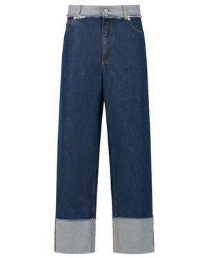 The Blue Denim Inside-Out Jeans in BluBlack by Marni are wide-leg jeans featuring a wide turn-up cuff and reverse waist for an inside-out look. Finishing details include tobacco stitching and a stone-washed treatment to reveal naturally frayed edges. Embroidered "M" on the back pocket. Printed Marni leather patch on the back waist. Primary fabric: 100% cotton woven. Style code: PAJD0635SYUSCY68WSB99. The model is 5'10" and is wearing size 40 IT. Made in Italy.