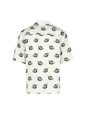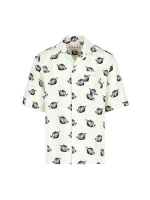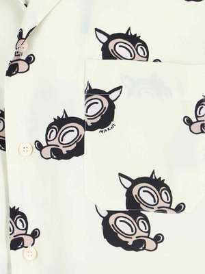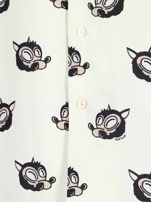 Marni viscose cream shirt with multicolor wolf print pattern, camp collar, short sleeves, button closure, chest pocket, black logo2 print detail, and straight hem. Composition: 100% Viscose.