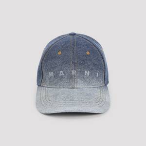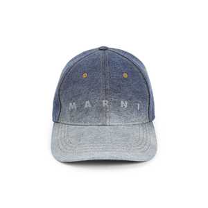 Men > Accessories > Hats Marni cotton baseball hat crafted from washed dgrad blue cotton denim, featuring contrasting stitching and eyelets, logo2 embroidery on the front, and an adjustable strap with buckle at the back.