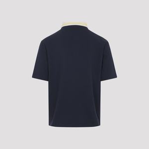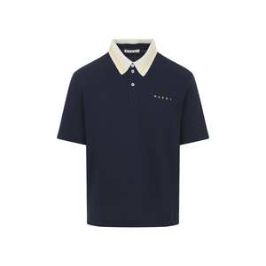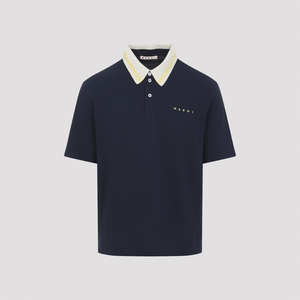 Men > Clothing > Topwear > Polo Shirts Marni blue cotton polo featuring a white collar with yellow striped detail, a front three-button fastening, logo2 embroidery on the chest, short sleeves, and a straight hem.
