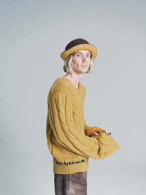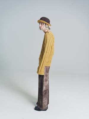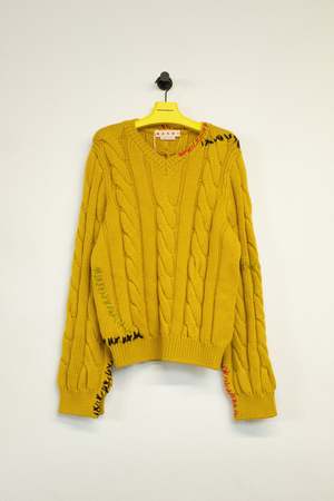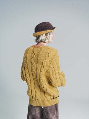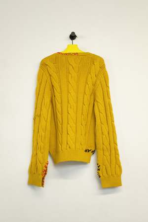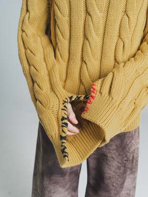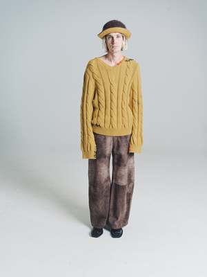 Cable-knit sweater with oversized sleeves. V neckline. Regular fit. Handmade mending in contrasting colour. Made in Italy. Wool Model wears Size 48