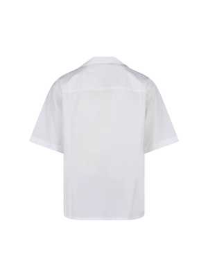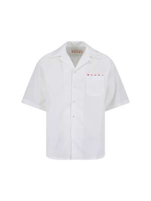 Men > Clothing > Shirts Marni bowling shirt in white cotton with a Cuban collar, short sleeves, button closure, front pocket, contrasting logo2 print on the front, and straight hem. Composition: 100% Cotton.