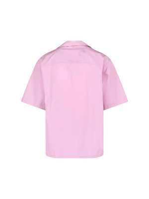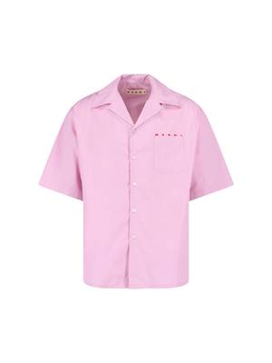Men > Clothing > Shirts Marni bowling shirt in pink cotton with a Cuban collar, short sleeves, button closure, front pocket, contrasting logo2 print on the front, and a straight hem. Composition: 100% cotton.