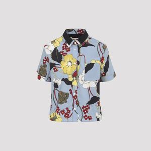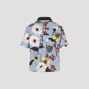 Women > Clothing > Topwear > Shirts Marni light blue cotton shirt. Crafted from light blue cotton poplin with the Melodia floral pattern, it features a pointed collar, front button fastening, a patch pocket on the chest, short sleeves with turn-up hems, a back yoke with a box pleat, and a straight hem.