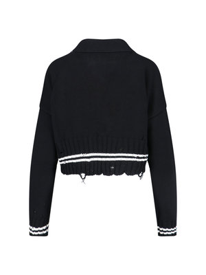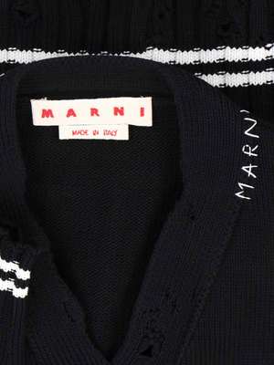 Marni V-neck cardigan in black cotton with all-over destroyed details, button closure, contrast stripe intarsia pattern, V-neck, contrast logo2 embroidery detail, ribbed trims, and raw cut hem. Composition: 100% Cotton.