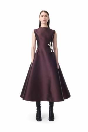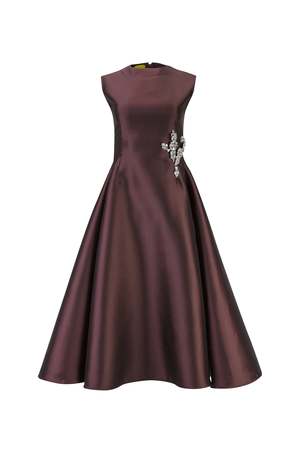This burgundy dress features a flattering A-line silhouette crafted from luxurious heavy satin. The sleeveless design with a round neckline offers sophistication, while embellishments add a touch of glamour. Color: Burgundy Details: - Dress - Sleeveless - A-line - Embellished - Round neckline