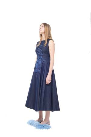 Marques Almeida's sleeveless midi dress reimagines classic denim through a romantic lens. Structured denim fabric provides a polished foundation, while delicate floral motifs introduce feminine sophistication. The streamlined sleeveless cut and flowing midi length create an effortlessly elegant silhouette that bridges casual and refined aesthetics. Versatile enough for daytime wear or evening occasions, it pairs seamlessly with sandals, sneakers, or layered pieces. A modern take on timeless style, this dress delivers understated charm with contemporary edge. 97% Organic Cotton, 3% Elastane.