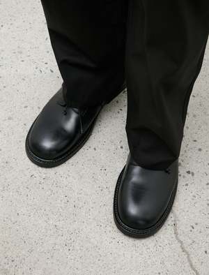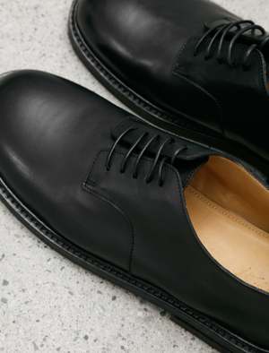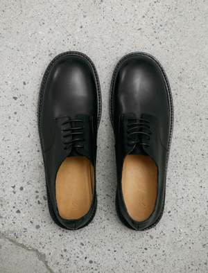 A five eyelet derby shoe cut from a buttery soft smooth leather with a soft shine in a deep black. Features a rounded toe with a straight foot profile lending a silhouette that draws the eye to the forefoot. Waxed laces and a sturdy Norwegian welt construction lend a rugged look that contrasts nicely with the formal feel of the foot profile. Completed with a leather outsole and a leather heel with rubber slip pad; fully lined in natural tan leather.