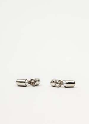 Silver-tone pill drop earring. Features a hinged construction which reveals a pearl. Engraved logo2 detailing across the face. One Size 925 Silver Imported