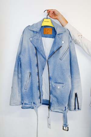 Supersize Biker Washed Indigo Denim Jacket, Fully Lined and featuring four pockets and bottom waist buckle. 100% Cotton / Lining: 51% Viscose 49% Cotton Model wears a Size Small