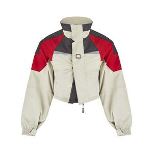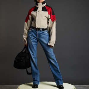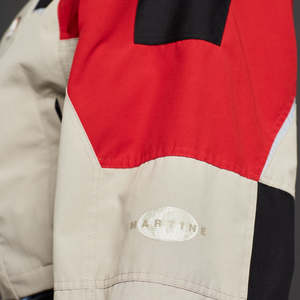 A Martine Rose sports jacket that plays with proportion. The body is pulled in for a tight, shrunken fit that retains comfort. The jacket features a high neck collar, front zip closure, adjustable under arm vents, reflective panels and piping and seasonal branding in the form of silicon, vinyl and rubber.