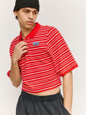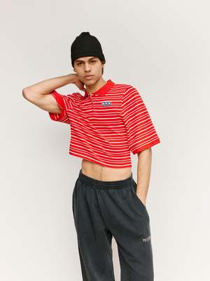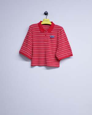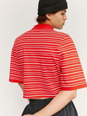 Lightweight, very cropped short sleeve polo featuring a red and white striped pattern and a seasonal logo2 motif on the front chest. Detailed with oversized wide sleeves.