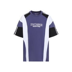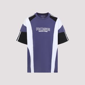 Men > Clothing > Topwear > T-Shirts Martine Rose purple indigo blue cotton oversized panelled T-shirt. Pure cotton T-shirt with round neck, chest contrasting white lettering logo2, and short sleeves. Features back stripes on the cuffs and sleeves, straight hem, side white details, indigo blue details on the shoulders, and a multipanel design.