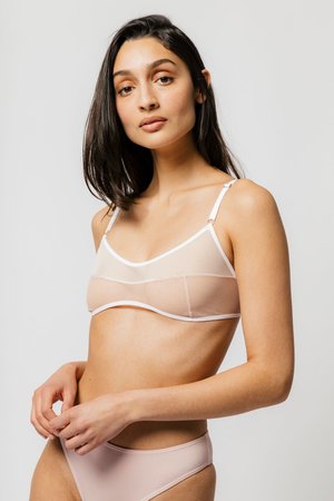 The Kendi Bra features single layer mesh in two tones - milkshake pink and cream - with thoughtful design lines to create a simplistic, sexy look. The mesh offers a supportive fit and will give to your natural shape. Offering adjustable shoulder straps and 3 / 8" bra band allows it to extend from a 32 - 38 band size, select size based on cup size. Pair with the Kendi Brief for a full mesh look. Note: this style is single layer mesh and nipples will be visible Fabric 80% Nylon, 20% Spandex mesh Fit and Size Runs true to size. See size chart Canadian designed and produced