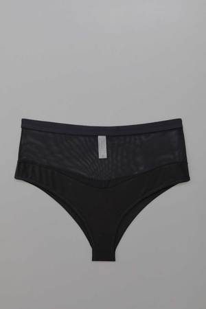 Our Logan Bikini is the perfect cheeky bottom with contrasting mesh paneling and a brazilian cut. Our super soft bamboo jersey and mesh will make you reconsider high rise. Designed to sit comfortably at your natural waist; this style is perfect for all day comfort. Maya is 5'7, size 12/14, and wears an X-Large Ethically made in Montreal, Canada